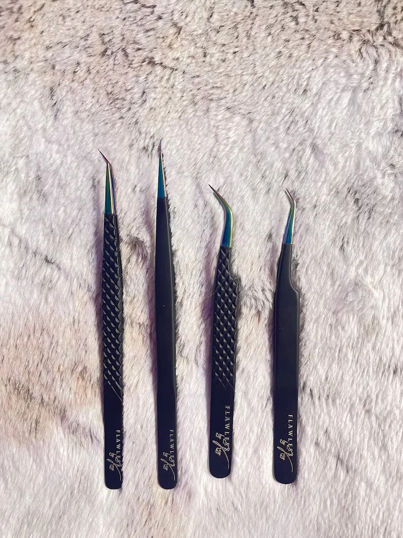 Fiber Grip Lash Tweezer Collection made by Flawless by Kay. All 4 tweezers included in the bundle are high quality fiber grip each hand tested.